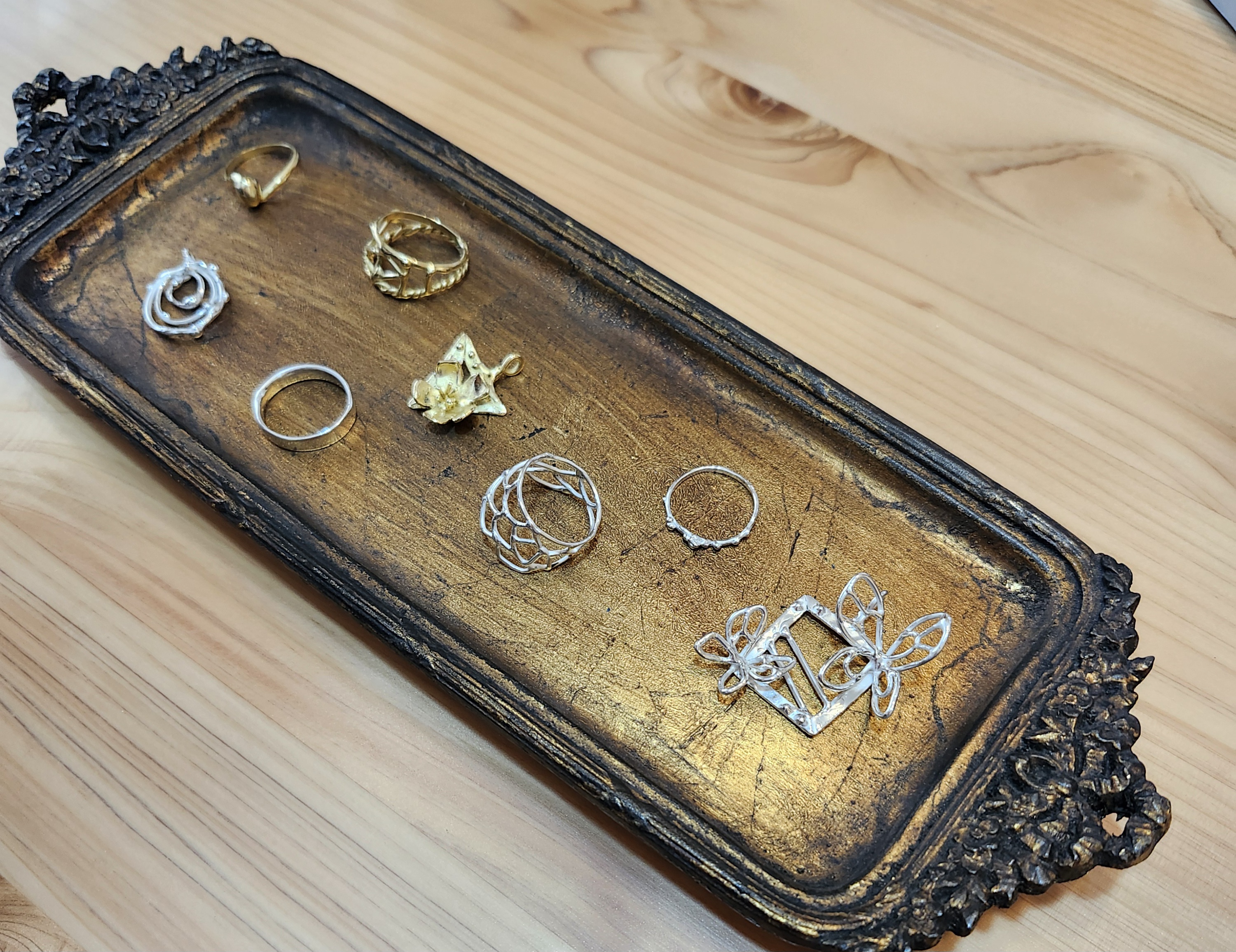 隣であざらしさんが細めのワックスで繊細な作品を次々作ってゆかれる傍らで、太めのワックスで、骨太な指環を作りました。