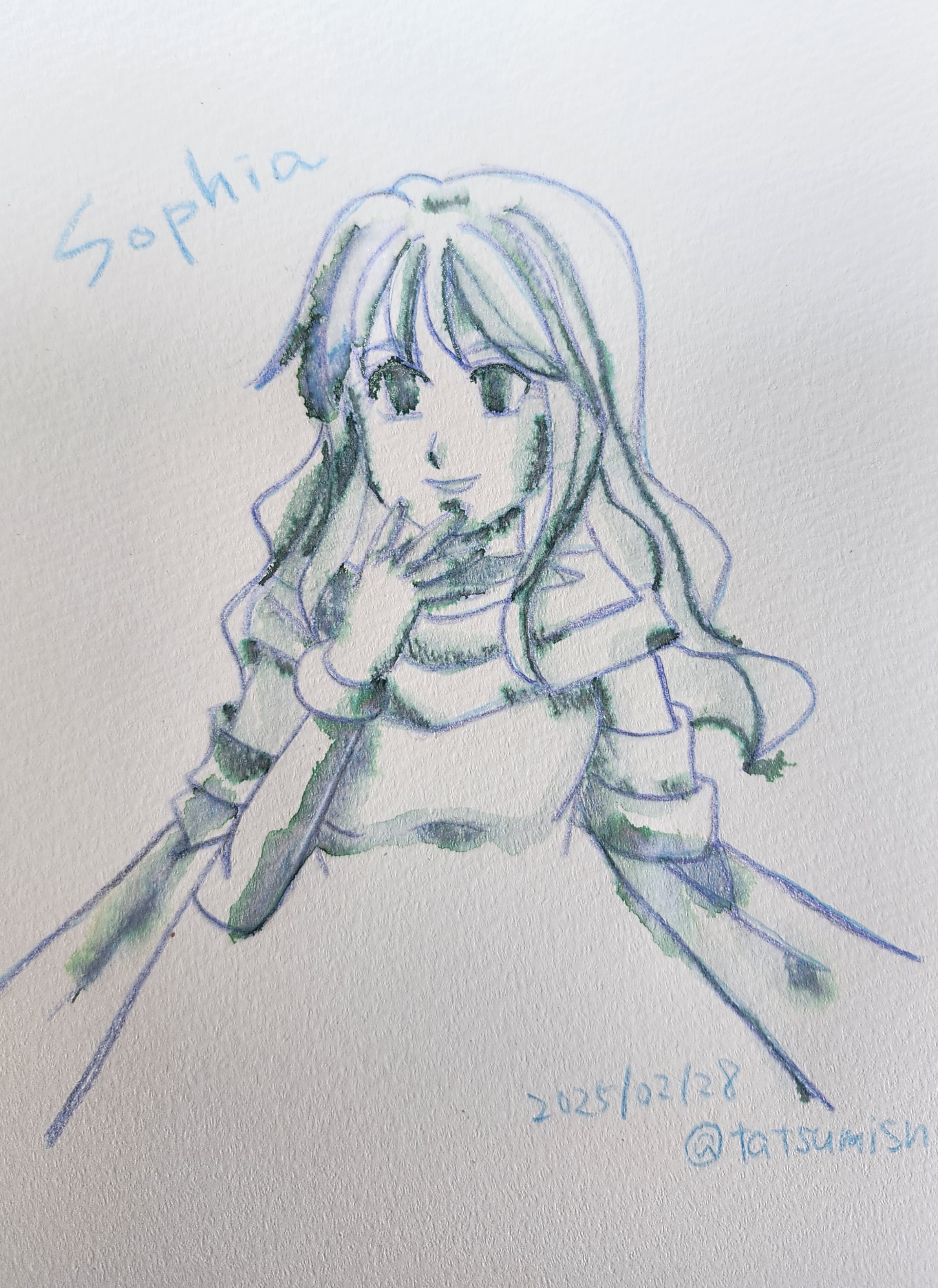 ガリガリ濃く塗るのではなくて、軽くなぞったところを水筆でガシガシ溶かすと、いいかんじに色が出ることを学びました。
