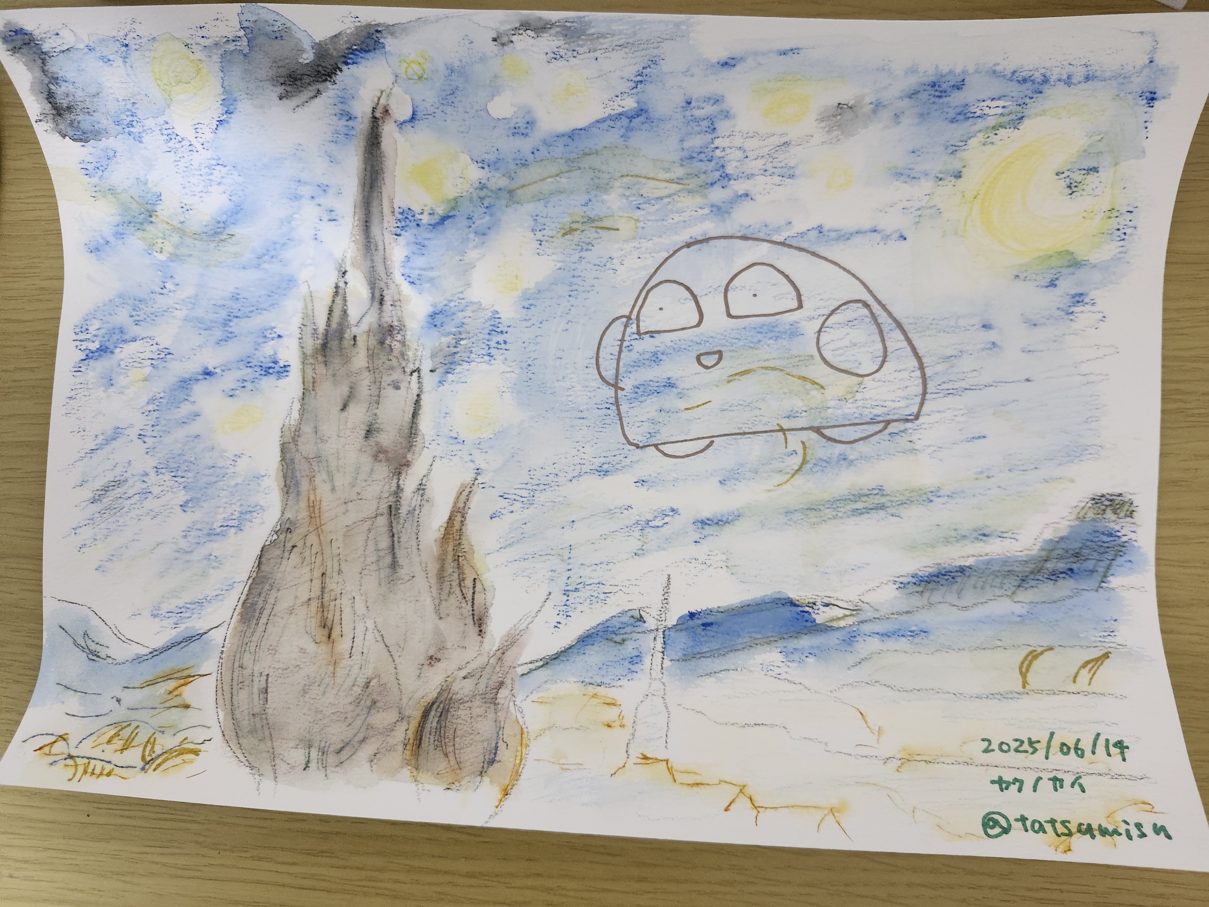 今回はゴッホの『星月夜』。病んでる時に見えた景色だそうなので、じゃあ今の私ならどうする? と描いた結果が畳んだ先にドン。