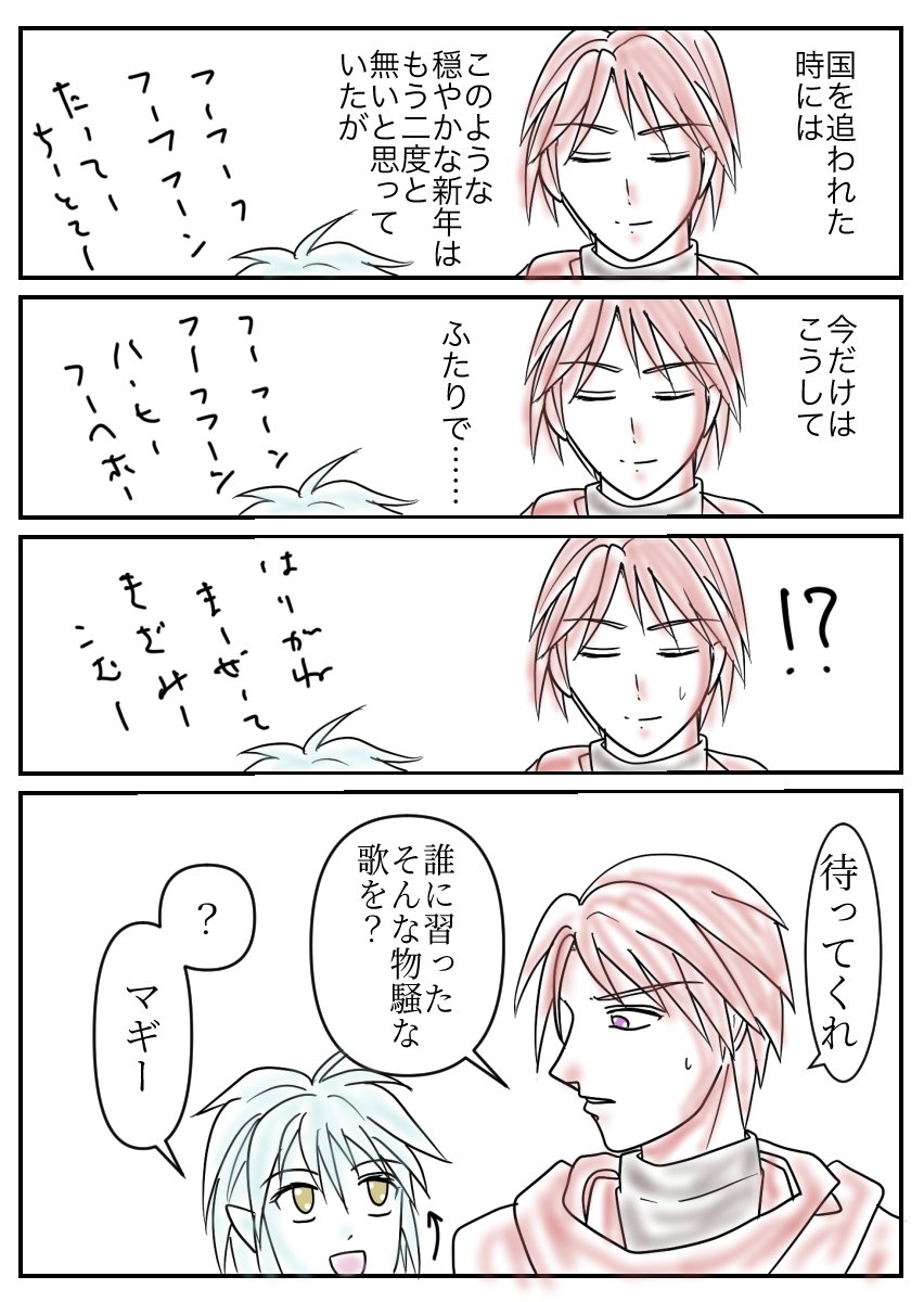 お正月のあの歌です。3コマ目のゼファーのフレーズが、昨日から頭の中で回ってて止まらなかったんですよ、ボスケテ。
