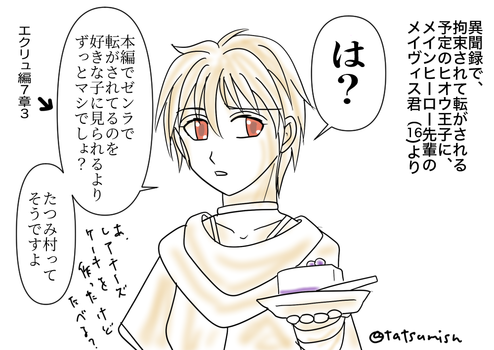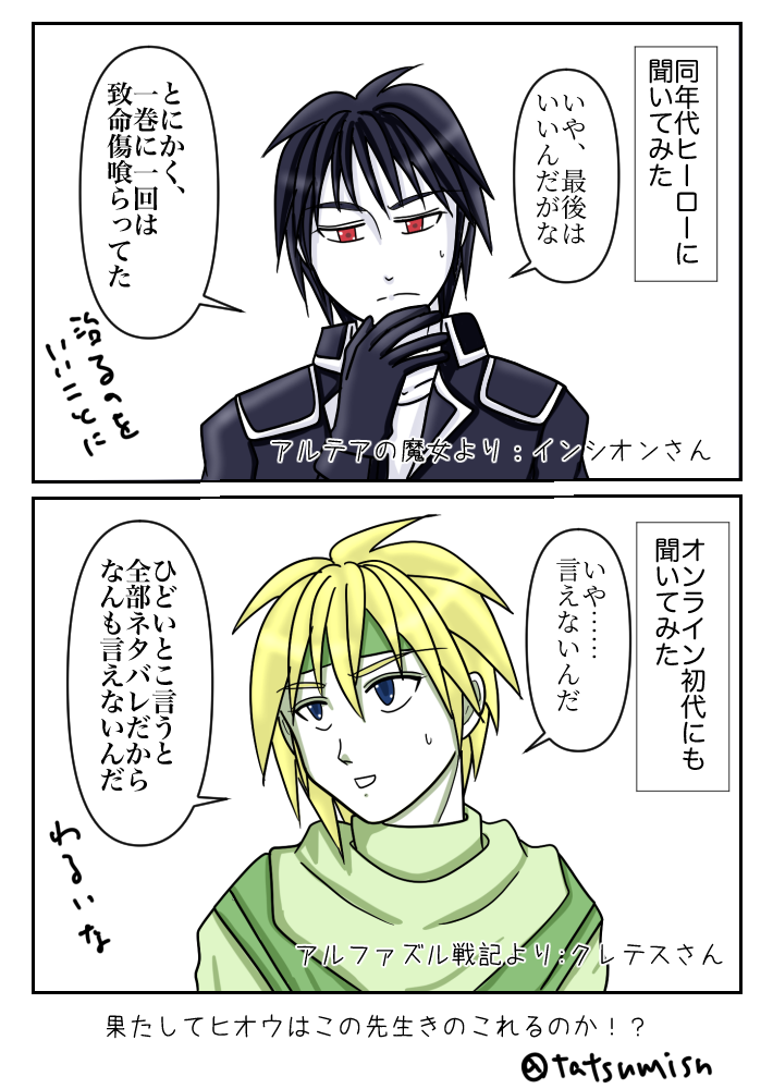他のメインヒーローにも、たつみ村のヒーローの扱いについて聞いてみました。一番年齢が近い人(ヒオウ27、インシオン29)と、『七月のなまけもの』最初のオンライン連載小説ヒーロー、クレテスに。